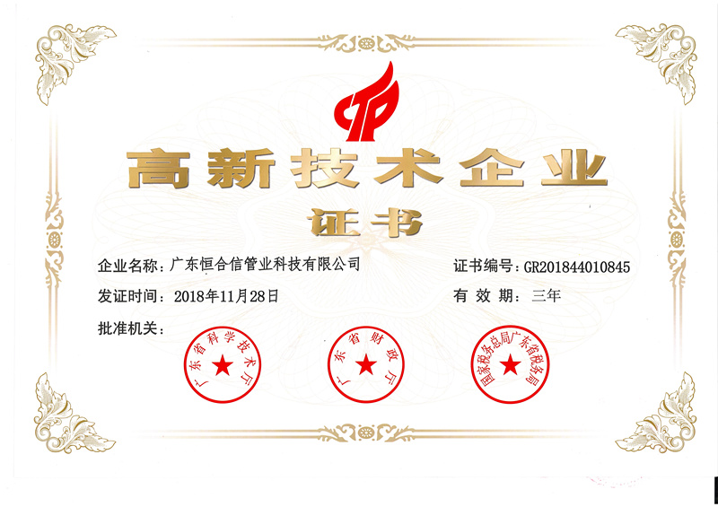 本次批準機關有廣東省科學技術廳、廣東省財政廳、國家稅務總局廣東省稅務局。高新技術企業(yè)的認定對公司產(chǎn)品領域、專利成果、研發(fā)投入、成長指標和人才結構等方面均有較高的要求。恒合信管業(yè)榮獲國家“高新技術企業(yè)”殊榮,這標志著公司在科研能力和整體技術水平上得到國家相關部門的高度肯定與認可。
